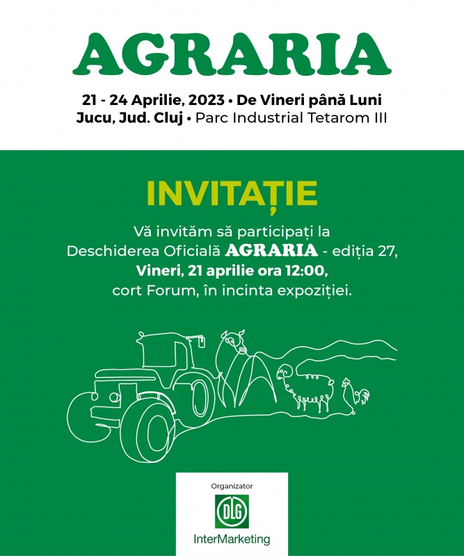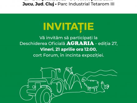 În perioada 21-24 Aprilie 2023 v-a așteptam cu mare drag pe toți partenerii și părțile interesate la ediția 27 a-l târgului AGRARIA situat în localitatea JUCU , județul CLUJ .